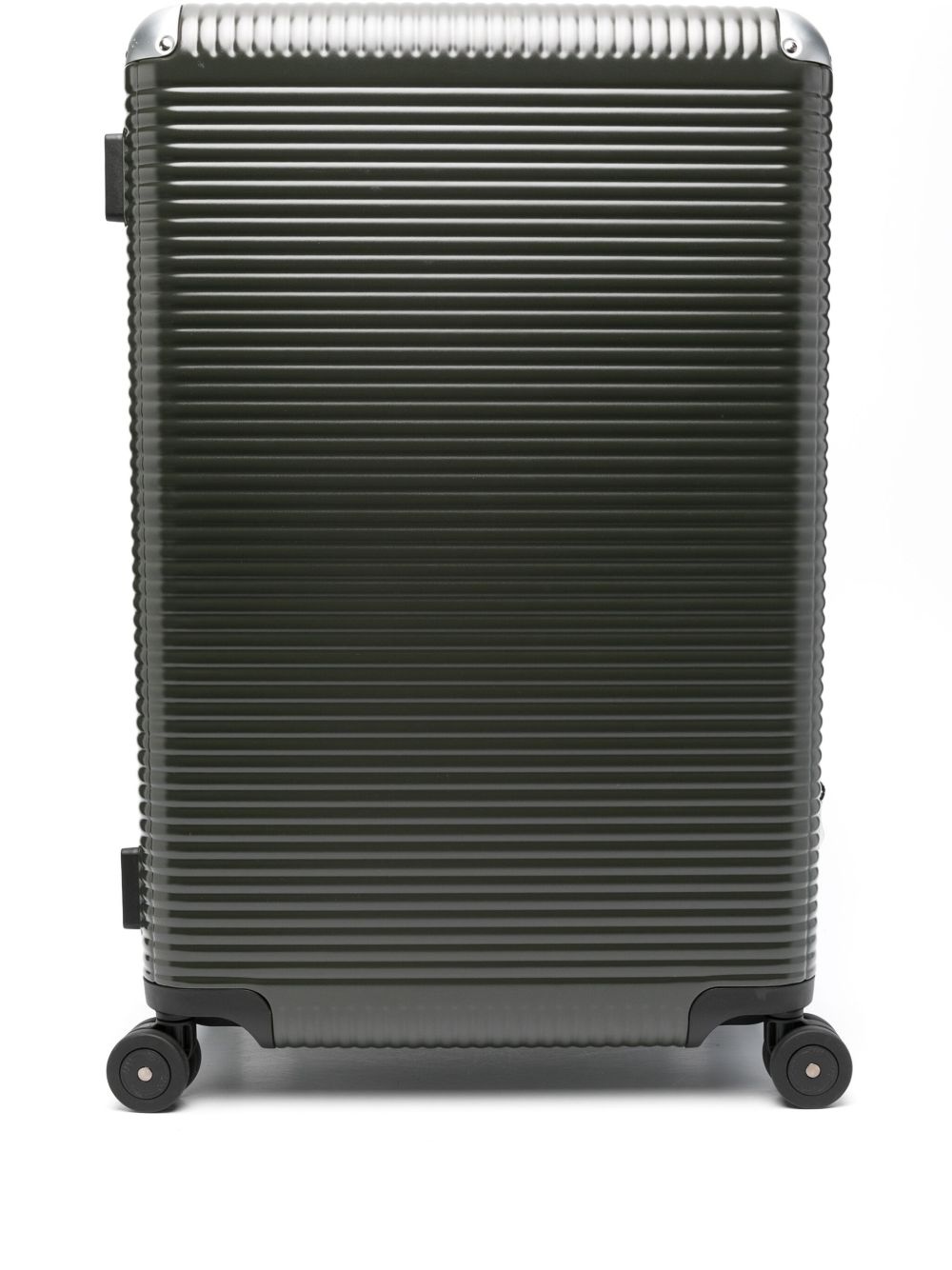 Bank Light Spinner 76 suitcase Highlights - Moss green - Wide ribbed - Bi-fold design - Two maxi butterfly locks - Combination lock - Single flat top handle - Single flat side handle - Telescopic handle - Four wheels - Full lining - Internal logo patch - Internal buckle-fastening straps - Internal zip-fastening pocket - Partitioned compartment - Silver-tone hardware Imported Composition Polycarbonite 100% SIZE & FIT Measurement DEPTH 11.22 in(28.5 cm) HANDLE 0.39 in(1 cm) HEIGHT 29.92 in(76 cm) WIDTH 18.89 in(48 cm)