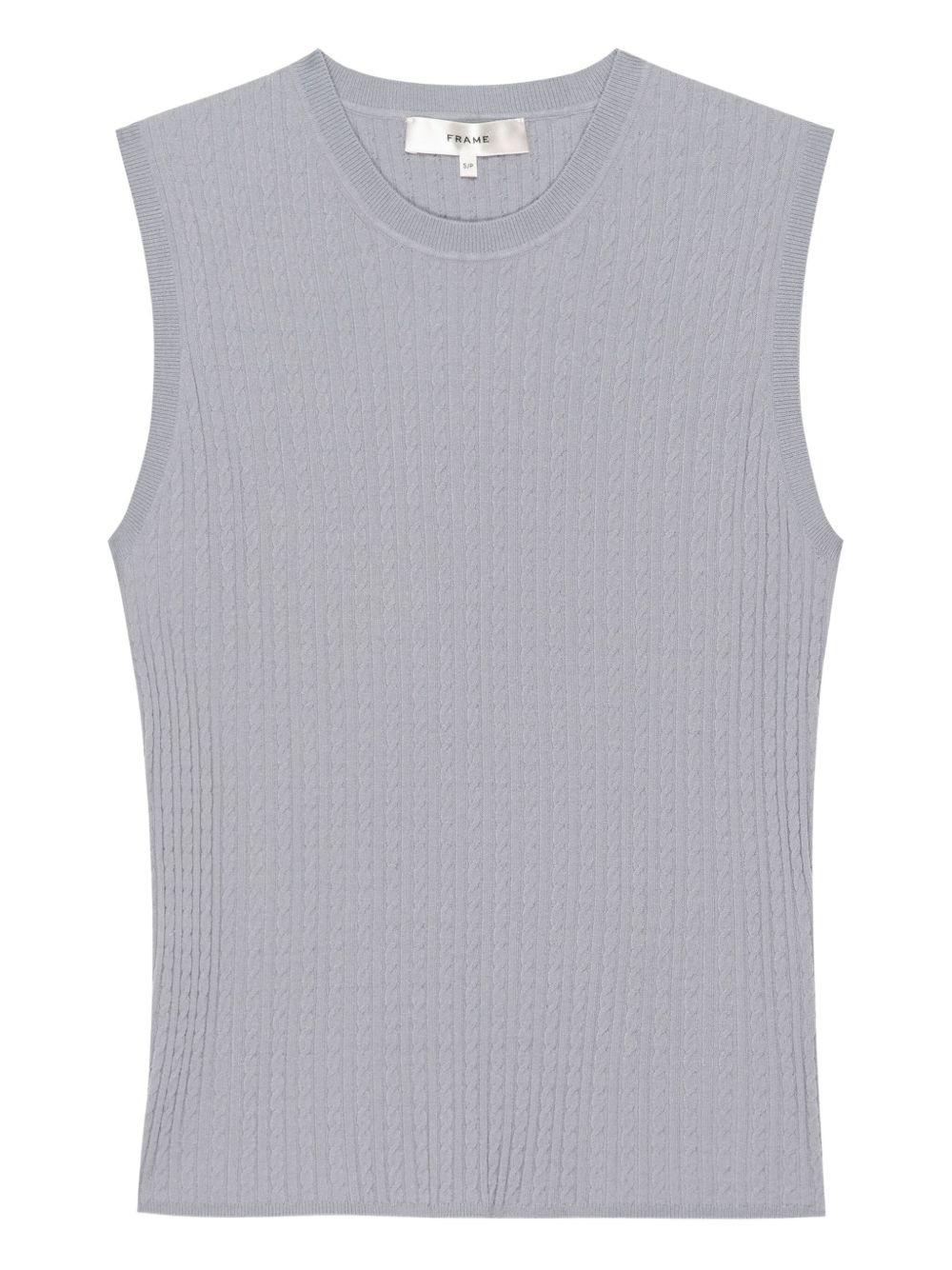 cable-knit sleeveless top Highlights - Grey - Cable knit - Round neck - Sleeveless - Straight hem Imported Composition Viscose 77%, Polyester 23% Washing instructions Read Manufacturer Guidelines
