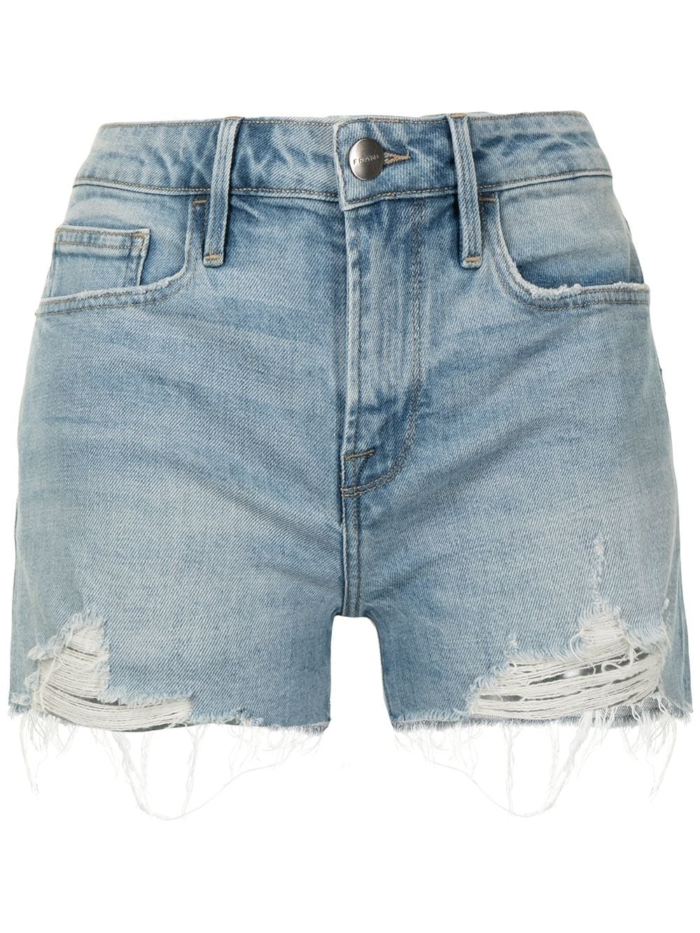 distressed denim shorts pale blue cotton distressed effect front button fastening two diagonal pockets to the sides two rear patch pockets Imported Composition Cotton 100% SIZE & FIT Model measurements Height 5 ft 9 in(1.76 m) Bust/Chest 29.13 in(74 cm) Hips 33.07 in(84 cm) Waist 22.83 in(58 cm) FittingInformation This piece fits true to size. We recommend you get your regular size Cut for a slim fit Made with a mid-weight fabric Washing instructions Machine Wash