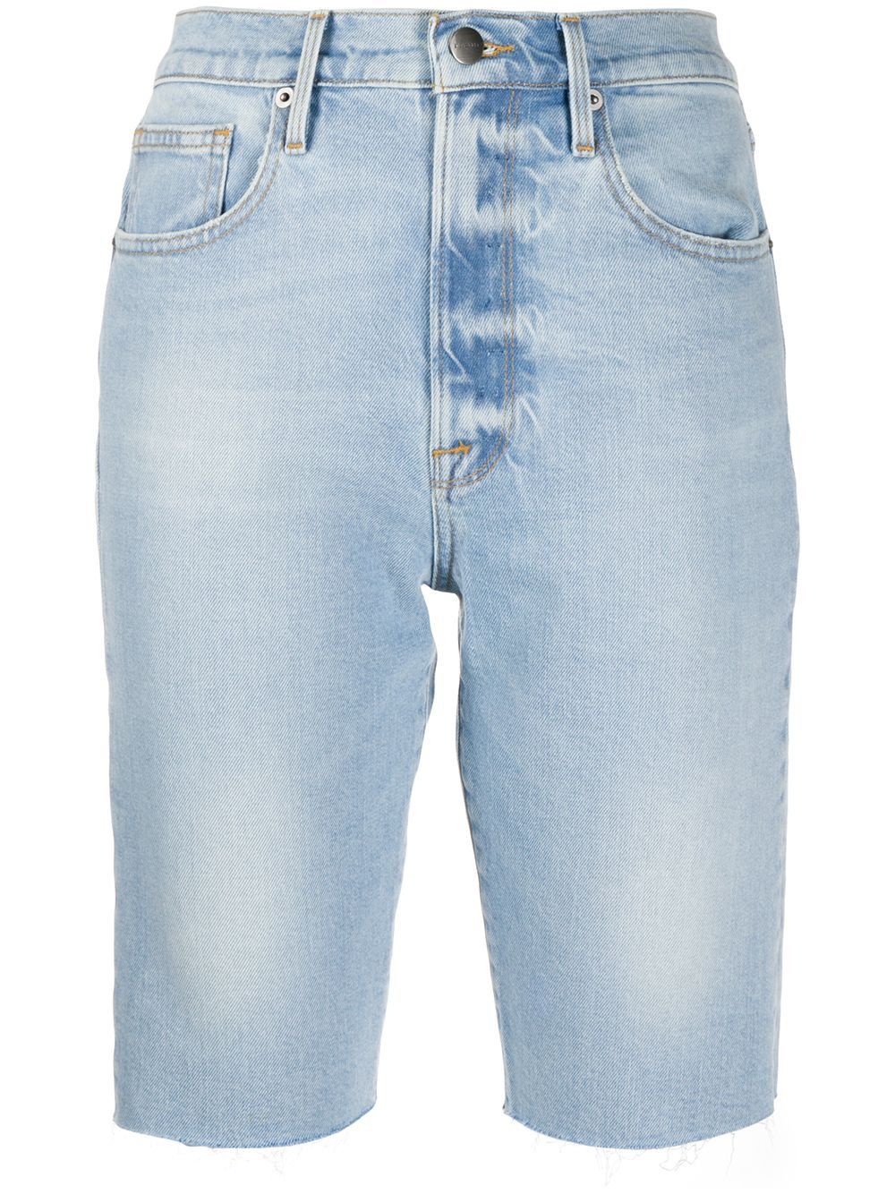 faded denim shorts Blue organic cotton faded denim shorts from FRAME featuring a mid rise, a waistband with belt loops, a button and zip fly and a five pocket design. POSITIVELY CONSCIOUS: At least 50% of the main material of this product meets our conscious criteria: for example, it's either organic, recycled, upcycled, or independently recognised as being better for the environment (such as linen, ramie, Tencel, etc.). Imported Composition Organic Cotton 94%, Recycled Polyester 3%, Spandex/Elastane 1% SIZE & FIT Model measurements Height 5 ft 10 in(1.78 m) Bust/Chest 31.49 in(80 cm) Hips 36.22 in(92 cm) Waist 25.59 in(65 cm) FittingInformation This piece fits true to size. We recommend you get your regular size Cut for a close fit Made with a mid-weight stretch fabric Washing instructions Machine Wash
