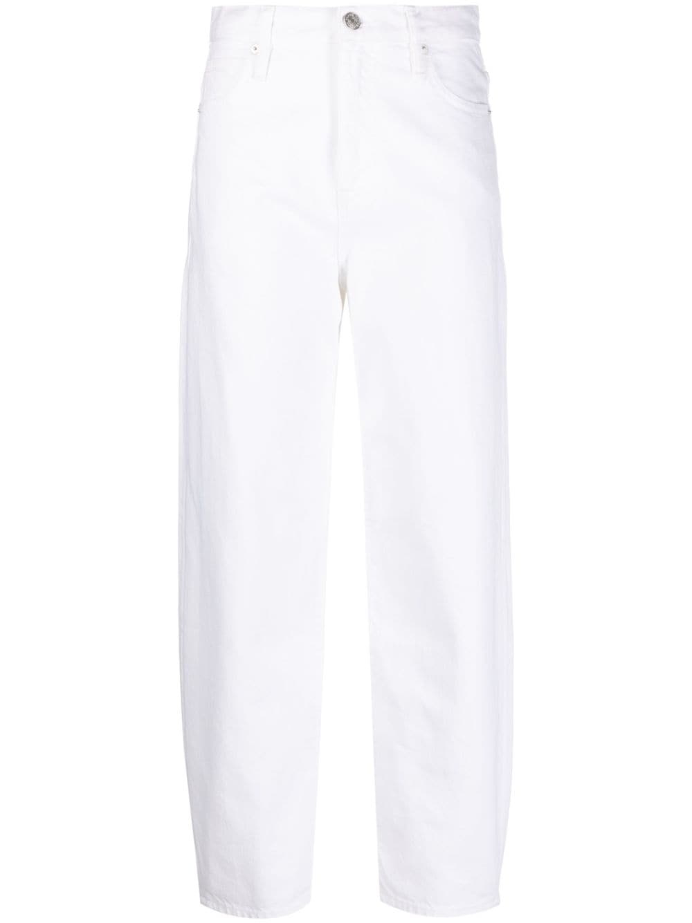 high-rise barrel jeans Presented in a fresh white hue, these jeans from Frame are characterised by a high-waisted silhouette and are complete with curved seams. Highlights - White - Cotton - High-waisted - Belt loops - Button fly fastening - Classic five pockets Imported Composition Cotton 100% SIZE & FIT FittingInformation Designed for a straight-leg fit, these jeans allow for a close fit at the waist and an unrestricted and comfortable fit over the leg Sturdy and hard-wearing, this denim piece offers no stretch This piece fits true to size – take your usual size Washing instructions Machine Wash