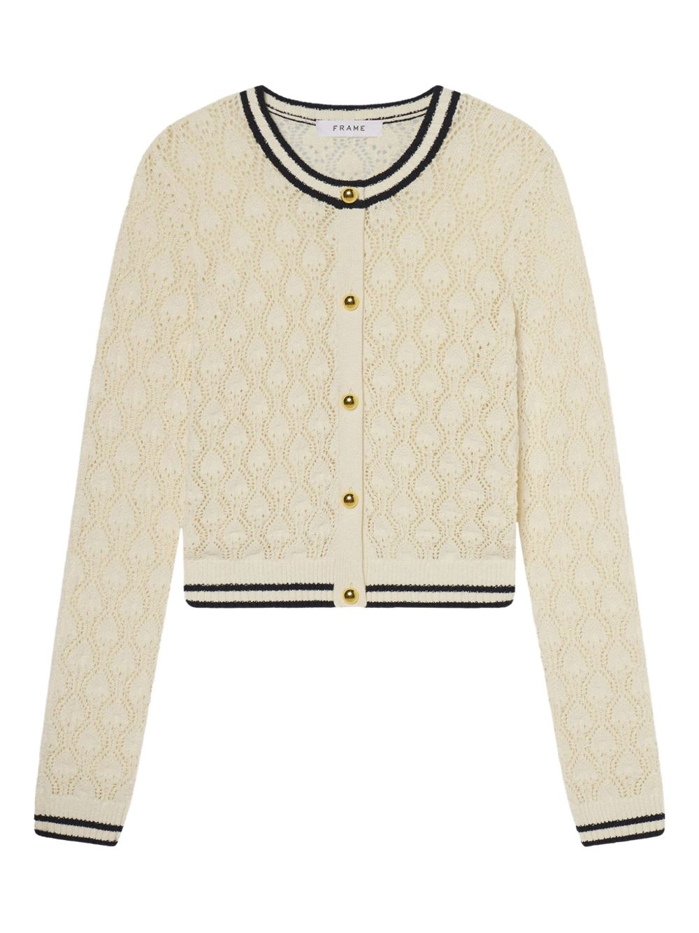 pointelle-knit cardigan Highlights - Cream - Diamond pattern - Ribbed collar and cuffs - Gold-tone button fastening - Contrasting stripes Imported Composition Cotton 75%, Polyamide 25% Washing instructions Dry Clean Only