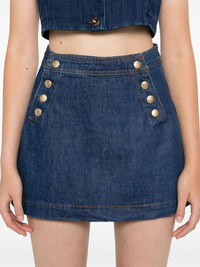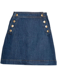 Sailor denim miniskirt Highlights - Indigo blue - Cotton blend - Denim - Contrast stitching - Logo-engraved buttons - Mid-rise - Front press-stud fastening - Two rear patch pockets - Straight hem - Thigh-length - A-line Imported Composition Regenerative Cotton 80%, Recycled Cotton 20% SIZE & FIT Model measurements Height 5 ft 9 in(1.75 m) Bust/Chest 31.88 in(81 cm) Hips 34.64 in(88 cm) Waist 24.01 in(61 cm) FittingInformation This mini-length skirt is intended to be worn high on the waist Sturdy and hard-wearing, this denim piece offers no stretch This piece fits large – take one size down Washing instructions Machine Wash