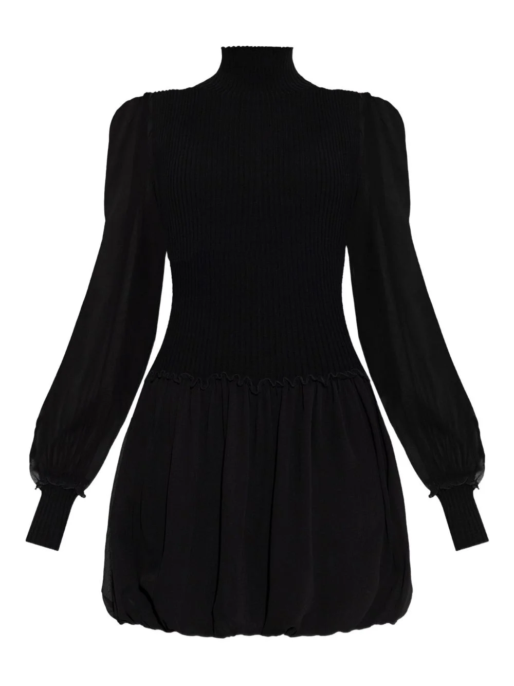sheer-sleeve mini dress Highlights - Black - High neck - Sheer long sleeves - Gathered skirt - Ribbed top Imported Composition Wool 100% Washing instructions Read Manufacturer Guidelines