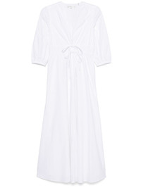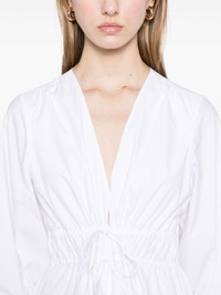 The Cinched midi dress Highlights - White - Tied waist - Buttoned cuffs - Two side slit pockets - Flared Imported Composition Organic Cotton 100% SIZE & FIT Model measurements Height 5 ft 9 in(1.75 m) Bust/Chest 31.88 in(81 cm) Hips 34.64 in(88 cm) Waist 24.01 in(61 cm) FittingInformation Designed for a close fit at the chest and waist with a loose fit at the hip The adjustable drawstring means that you can adjust this piece’s fit to suit your comfort and preference Made from a midweight non-stretch fabric Washing instructions Machine Wash