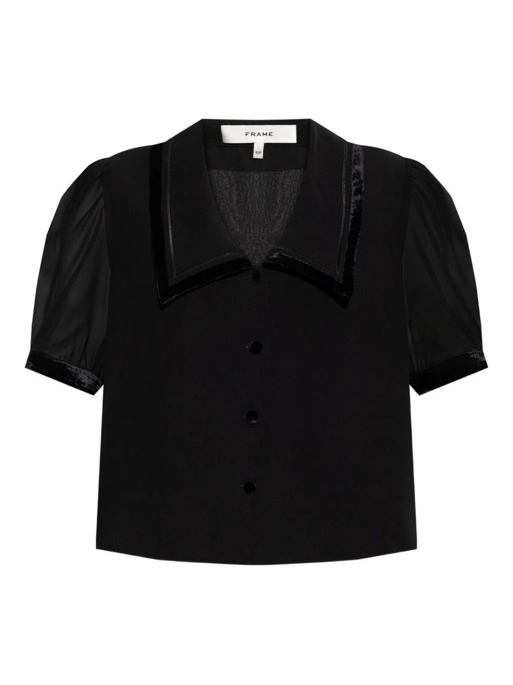 velvet-trim blouse Highlights - Black - Velvet trim - Button fastening - Short sleeves - Sheer sleeves - Point collar Imported Composition Silk 100%