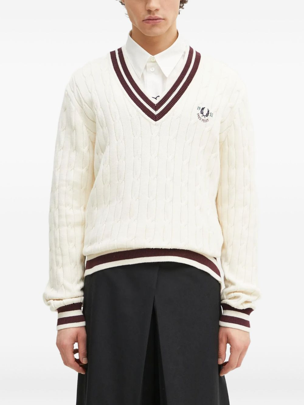 cable-knit V-neck sweater Highlights - White - Cable knit - V-neck - Burgundy tipping - Embroidered logo - Long sleeves Imported Composition Cotton 92%, Fabric 8% Washing instructions Read Manufacturer Guidelines