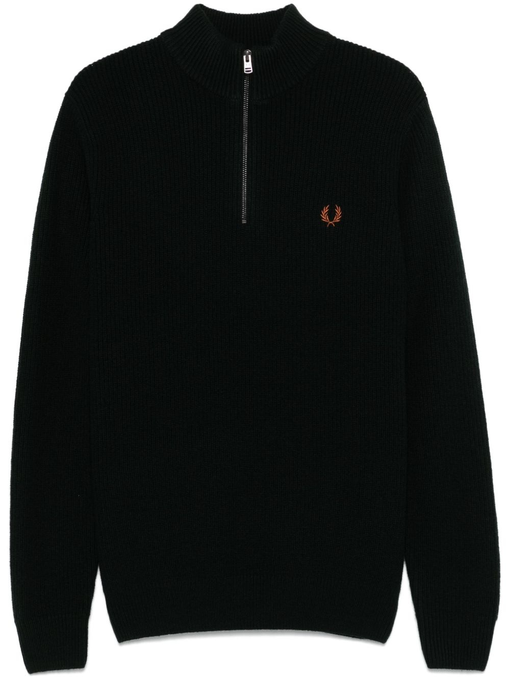 half-zip sweater Highlights - Dark green - Short front zip fastening - Ribbed cuffs and hem - High neck - Embroidered logo at the chest Imported Composition Wool 100%