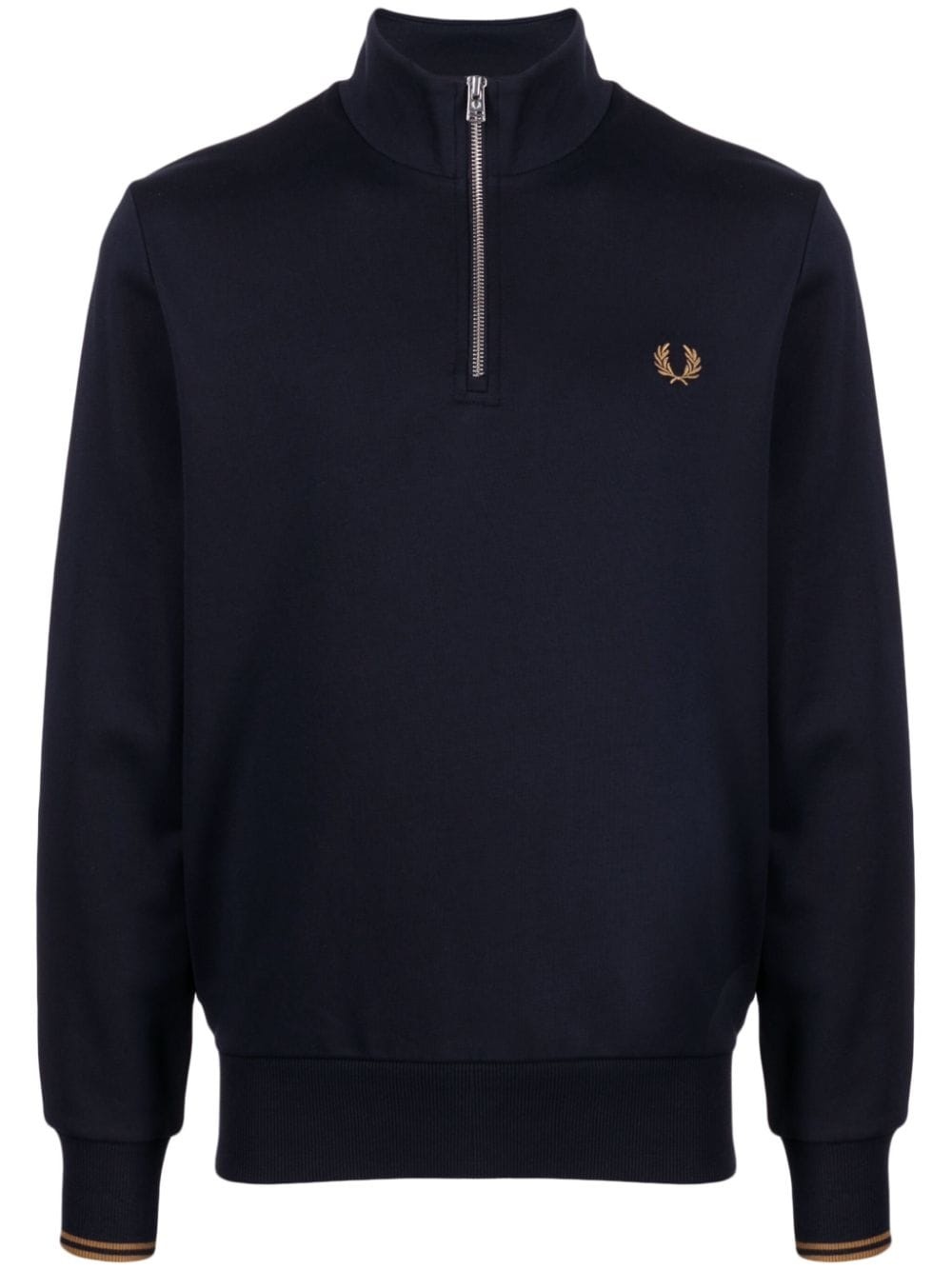 logo-embroidered cotton sweatshirt Highlights - Navy blue - Cotton - Embroidered logo at the chest - Stand-up collar - Short front zip fastening - Long sleeves - Ribbed cuffs and hem - Straight hem Made in United Kingdom Composition Cotton 100% SIZE & FIT Model measurements Height 6 ft 3 in(1.9 m) Bust/Chest 35.03 in(89 cm) Hips 36.61 in(93 cm) Waist 29.13 in(74 cm) FittingInformation Designed for a regular fit, offering a comfortable loose fit throughout the body Made from a midweight non-stretch fabric, this piece offers minimal elasticity when worn This piece fits true to size – take your usual size Washing instructions Machine Wash