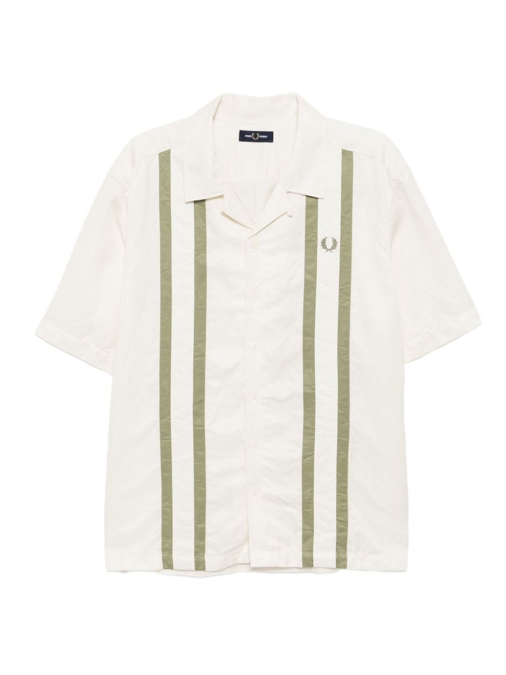 logo-embroidered striped shirt Highlights - Ivory - Front button fastening - Cuban collar - Short sleeves Imported Composition Lyocell 55%, Linen/Flax 45% Washing instructions Machine Wash