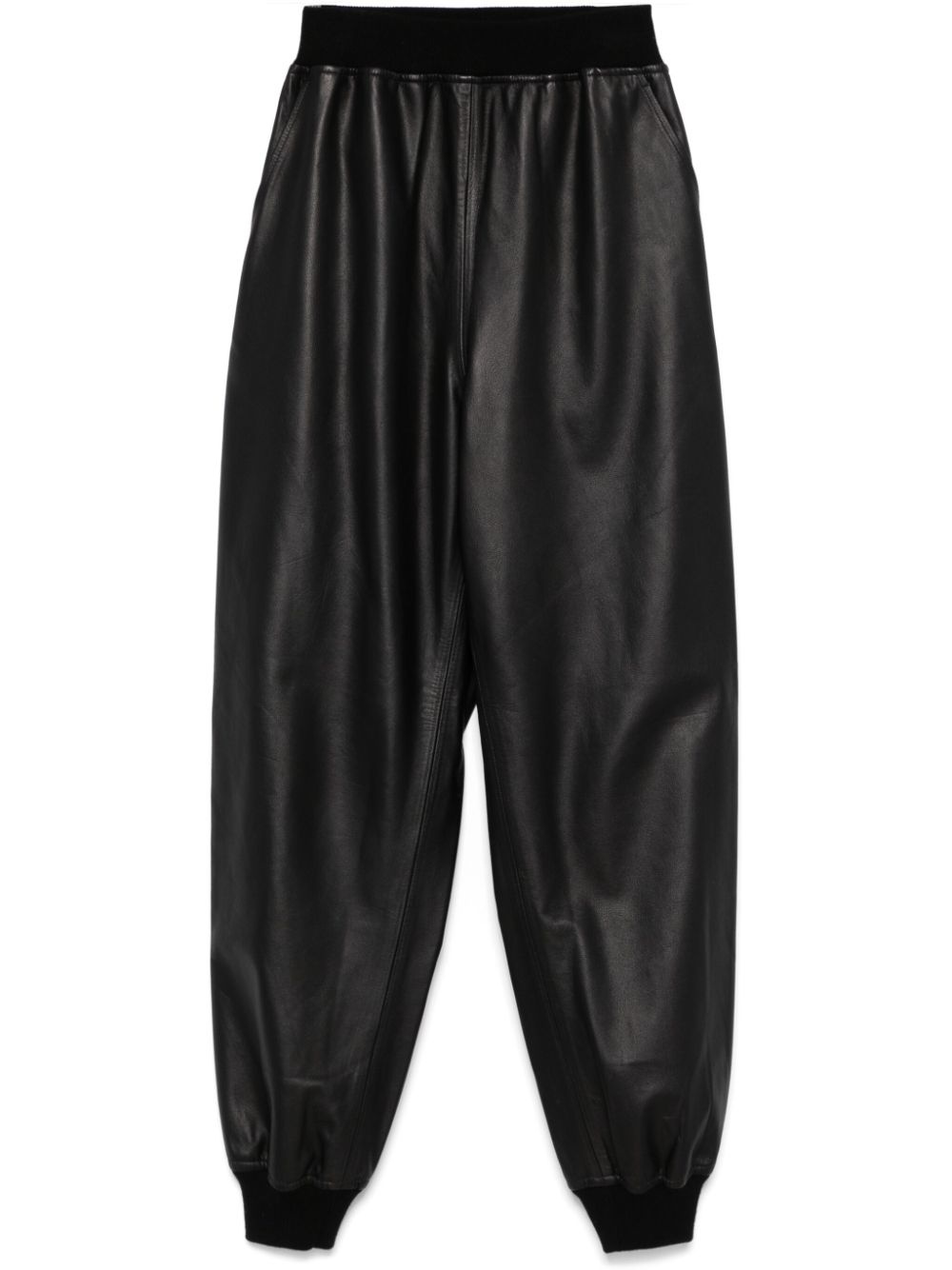 leather trousers Highlights - Black - Goatskin - Smooth grain - Elasticated waistband - High waist - Two side slit pockets - Tapered leg - Ribbed ankles Imported Composition Goat Skin 100% SIZE & FIT Model measurements Height 5 ft 11 in(1.8 m) Bust/Chest 31.49 in(80 cm) Hips 36.61 in(93 cm) Waist 24.4 in(62 cm) FittingInformation Designed for a relaxed tapered cut, these trousers allow for a close fit at the waist and offer a loose fit at the thighs, with a closer fit toward the ankles The elasticated waist allows for a comfortable fit Soft leather has a supple and smooth construction offering some flexibility