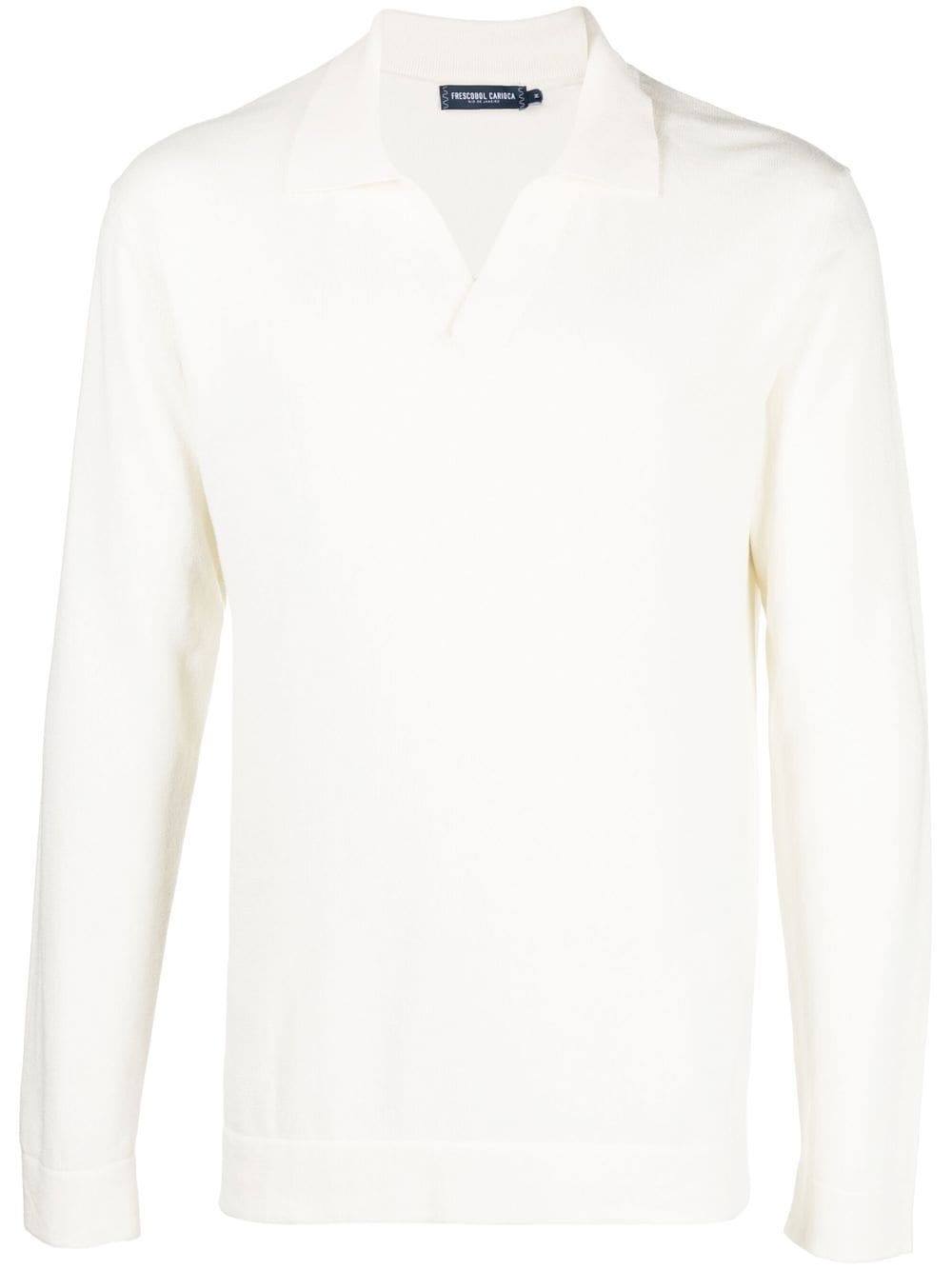 knitted long-sleeve polo shirt white cotton-wool blend fine knit polo collar front slit long sleeves straight hem Made in Italy Composition Cotton 85%, Wool 15% SIZE & FIT Model measurements Height 6 ft 2 in(1.89 m) Bust/Chest 35.82 in(91 cm) Hips 37.99 in(96.5 cm) Waist 32.28 in(82 cm) Measurement CHEST 45.47 in(115.5 cm) SLEEVE LENGTH 26.37 in(67 cm) LENGTH 29.52 in(75 cm) FittingInformation This piece fits true to size. We recommend you get your regular size Cut for a relaxed fit Made with a mid-weight fabric
