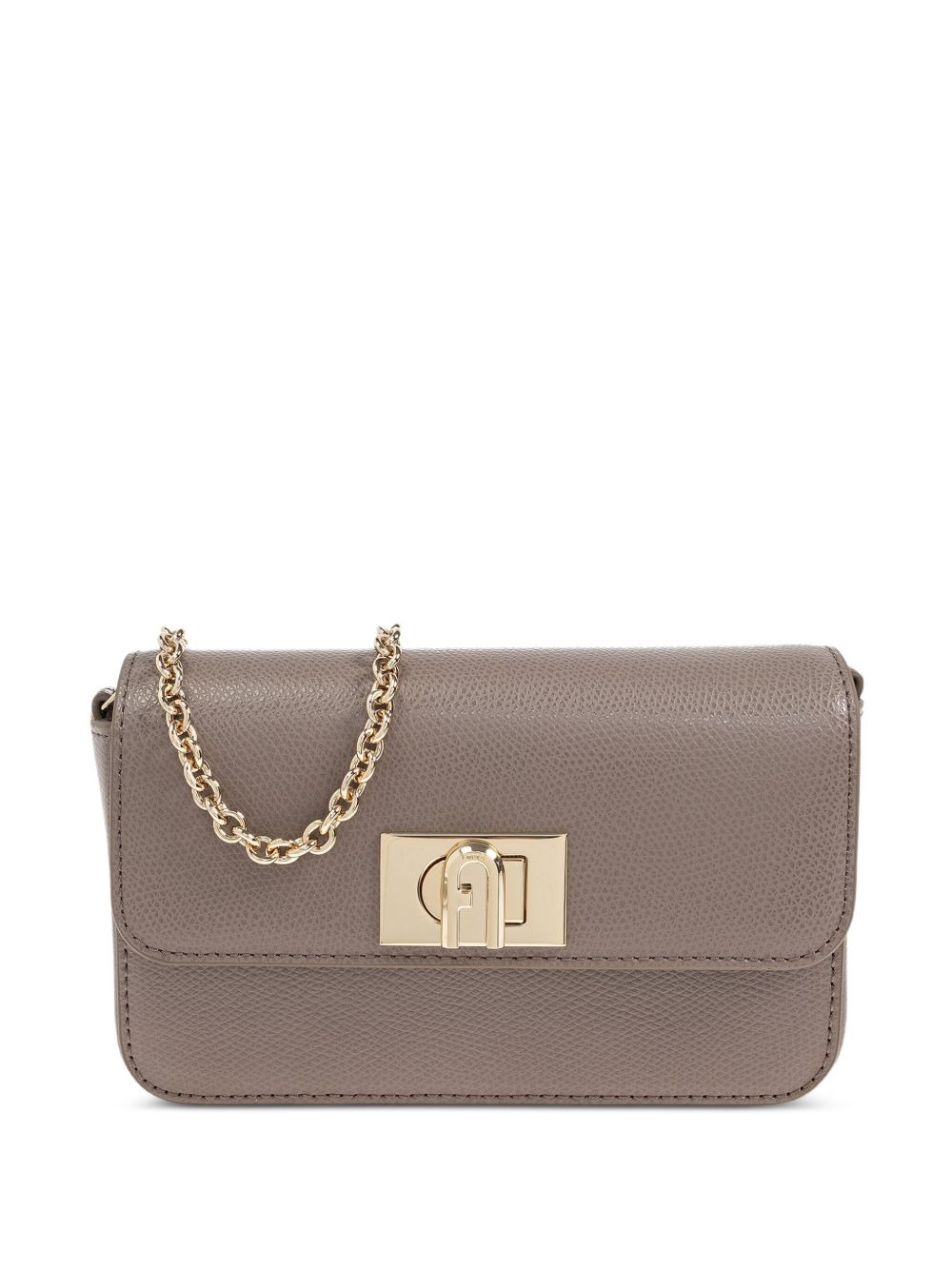 Furla 1927 leather crossbody bag Highlights - Grey - Leather - Gold-tone twist-lock fastening - Chain shoulder strap - Front flap closure - Rectangular shape Imported Composition Outer: Leather 100% Lining: Polyester 80%, Nylon 10%, Polyurethane 10% SIZE & FIT Measurement DEPTH 1.57 in(4 cm) HEIGHT 3.93 in(10 cm) WIDTH 6.69 in(17 cm)