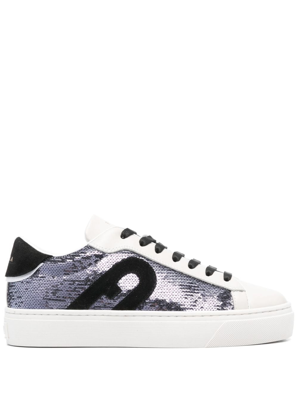 Furla Enjoy sneakers Highlights - Silver-tone/light beige/black - Calf leather - Smooth grain - Front lace-up fastening - Panelled design - Sequin panelling - Contrasting branded heel counter - Logo patch to the side - Logo-print tongue - Round toe - Branded insole - Rubber sole Imported Composition Leather 100% SIZE & FIT Measurement HEEL 1.37 in(3.5 cm) Sole height 1.18 in(3 cm)