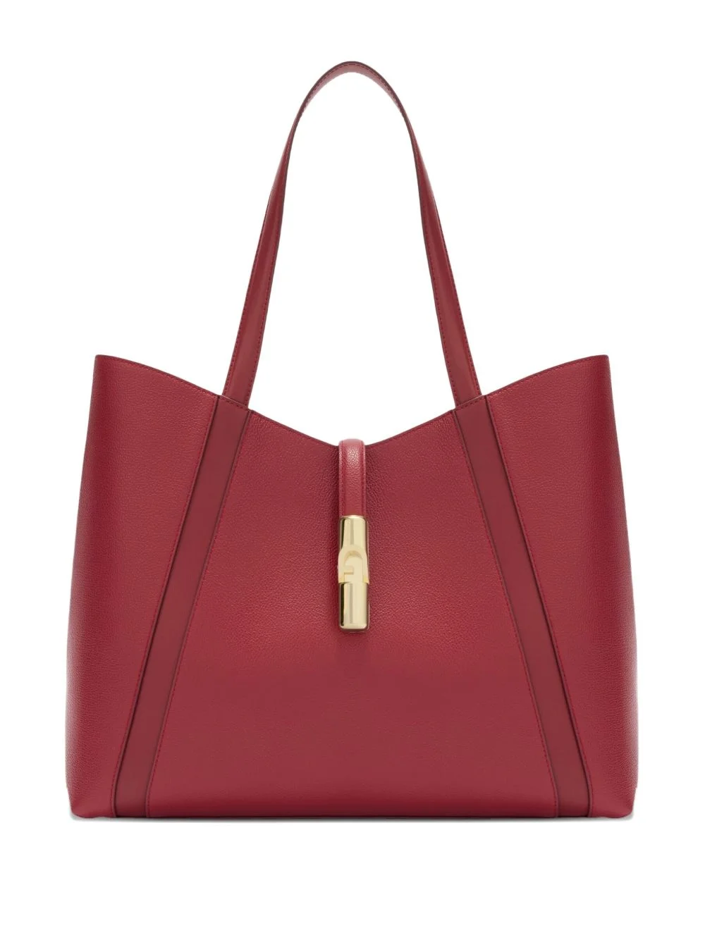 large Goccia tote bag Highlights - Dark red - Pebbled leather - Clasp fastening - Top handles - V-shaped panel detail - Structured shape Imported Composition Outer: Calf Leather 100% SIZE & FIT Measurement DEPTH 4.33 in(11 cm) HEIGHT 12.2 in(31 cm) WIDTH 13.18 in(33.5 cm)
