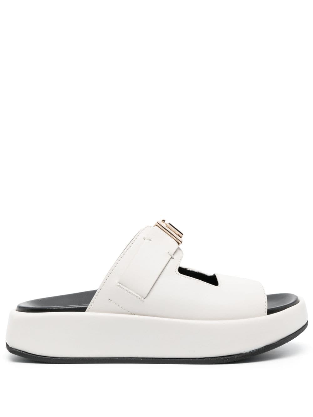 logo-plaque leather platform slides Highlights - Cream white - Calf leather - Gold-tone logo plaque - Tonal stitching - Cut-out detailing - Open toe - Slip-on style - Branded leather insole - Platform sole Imported Composition Leather 100% SIZE & FIT Measurement HEEL 1.77 in(4.5 cm) Sole height 1.18 in(3 cm)