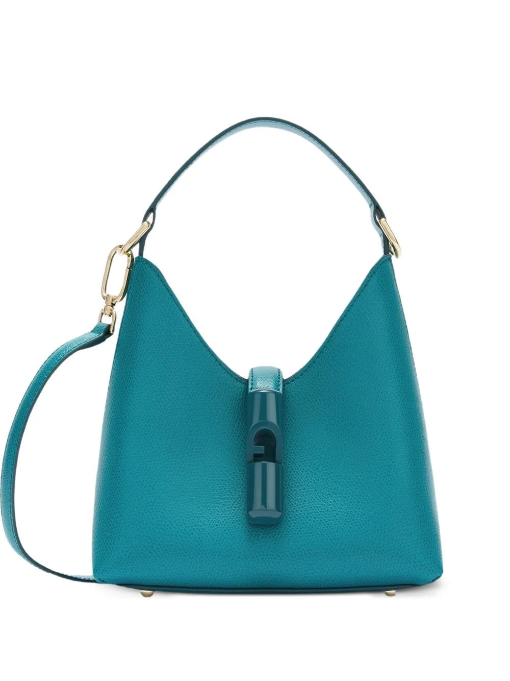Mini Iride printed trapezoidal tote bag Highlights - Blue - Leather - Cylindrical hardware - Detachable adjustable strap - Top handle - Metal feet - Internal zip pocket Imported Composition Outer: Calf Leather 100% Lining: Polyester 90%, Calf Leather 10% SIZE & FIT Measurement DEPTH 3.93 in(10 cm) HEIGHT 7.28 in(18.5 cm) WIDTH 7.28 in(18.5 cm)