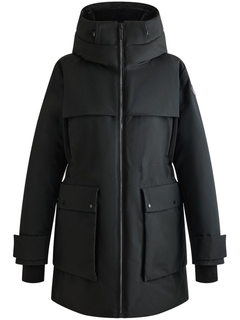 Elisabeth coat Highlights - Black - Front zip fastening - Two side stud-fastening pockets - Belted cuffs - Drawstring hood Imported Composition Outer: Polyester 87%, Polyurethane 13% Lining: Polyamide 100%, Polyester 100%, Duck Down 80%, Duck Feathers 20% Washing instructions Machine Wash