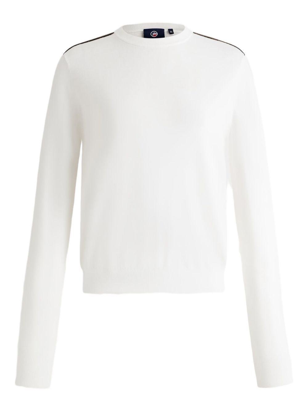 striped-detail sweater Highlights - White - Striped shoulder detail - Round neck - Long sleeves - Knit texture Imported Composition Viscose 54%, Wool 30%, Polyester 16% Washing instructions Read Manufacturer Guidelines