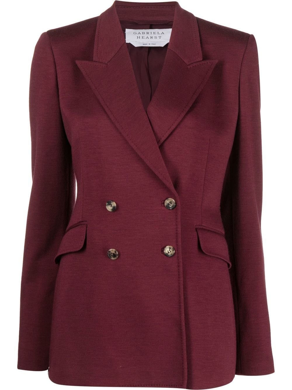 double-breasted wool-blend blazer burgundy merino wool blend notched lapels double-breasted button fastening long sleeves two side flap pockets full lining central rear vent Made in Italy Composition Lining: Polyamide 100%, Viscose 53%, Cupro 47% Outer: Merino 100% SIZE & FIT Model measurements Height 5 ft 10 in(1.78 m) Bust/Chest 33.07 in(84 cm) Hips 36.61 in(93 cm) Waist 24.8 in(63 cm) Measurement CHEST 35.43 in(90 cm) SLEEVE LENGTH 24.8 in(63 cm) LENGTH 28.34 in(72 cm) FittingInformation This piece fits true to size. We recommend you get your regular size Cut for a slim fit Made with a mid-weight fabric