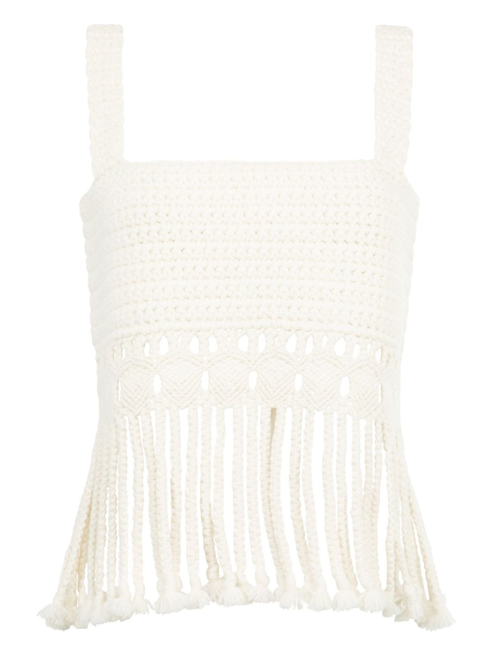 Lilea crocheted fringed top Highlights - White - Square neckline - Wide shoulder straps - Open weave detailing - Fringing at hem Imported Composition Wool 70%, Cashmere 30% Washing instructions Read Manufacturer Guidelines