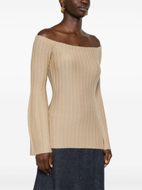 Nelson sweater Highlights - Barley brown - Wool-cashmere blend - Ribbed knit - Off-shoulder - Long wide sleeves - Straight hem Imported Composition Wool 90%, Cashmere 10% SIZE & FIT Model measurements Height 5 ft 10 in(1.77 m) Bust/Chest 32.28 in(82 cm) Hips 35.03 in(89 cm) Waist 25.19 in(64 cm) FittingInformation Designed for a slim fit that sits just away from the body offering a close yet comfortable fit Made with a midweight knit, this piece offers some stretch This piece fits true to size – take your usual size