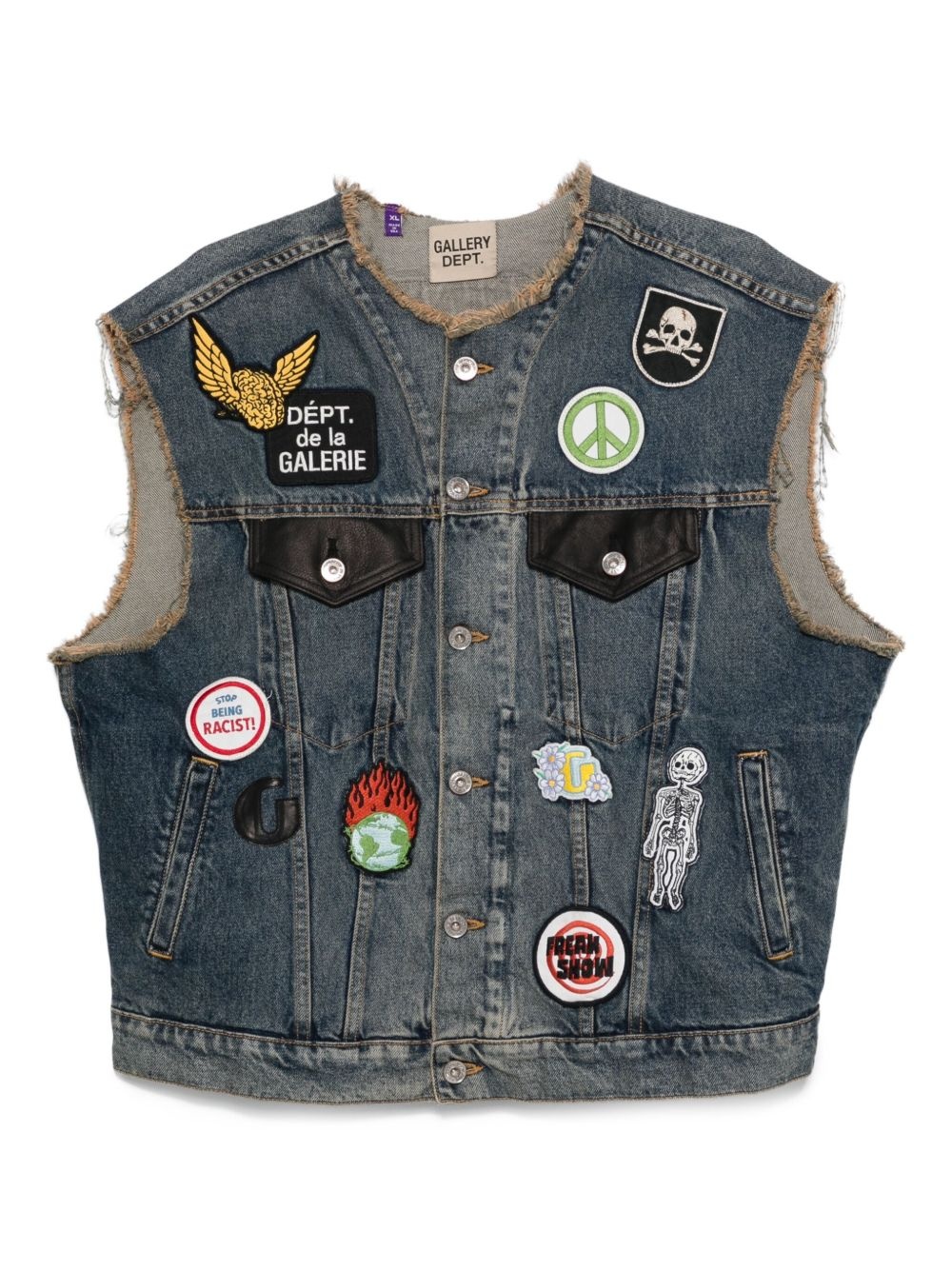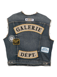 denim waistcoat Highlights - Indigo blue - Front button fastening - Sleeveless - Multiple patches - Side slit pockets - Chest flap pockets Made in United States Composition Cotton 100% Washing instructions Dry Clean Only