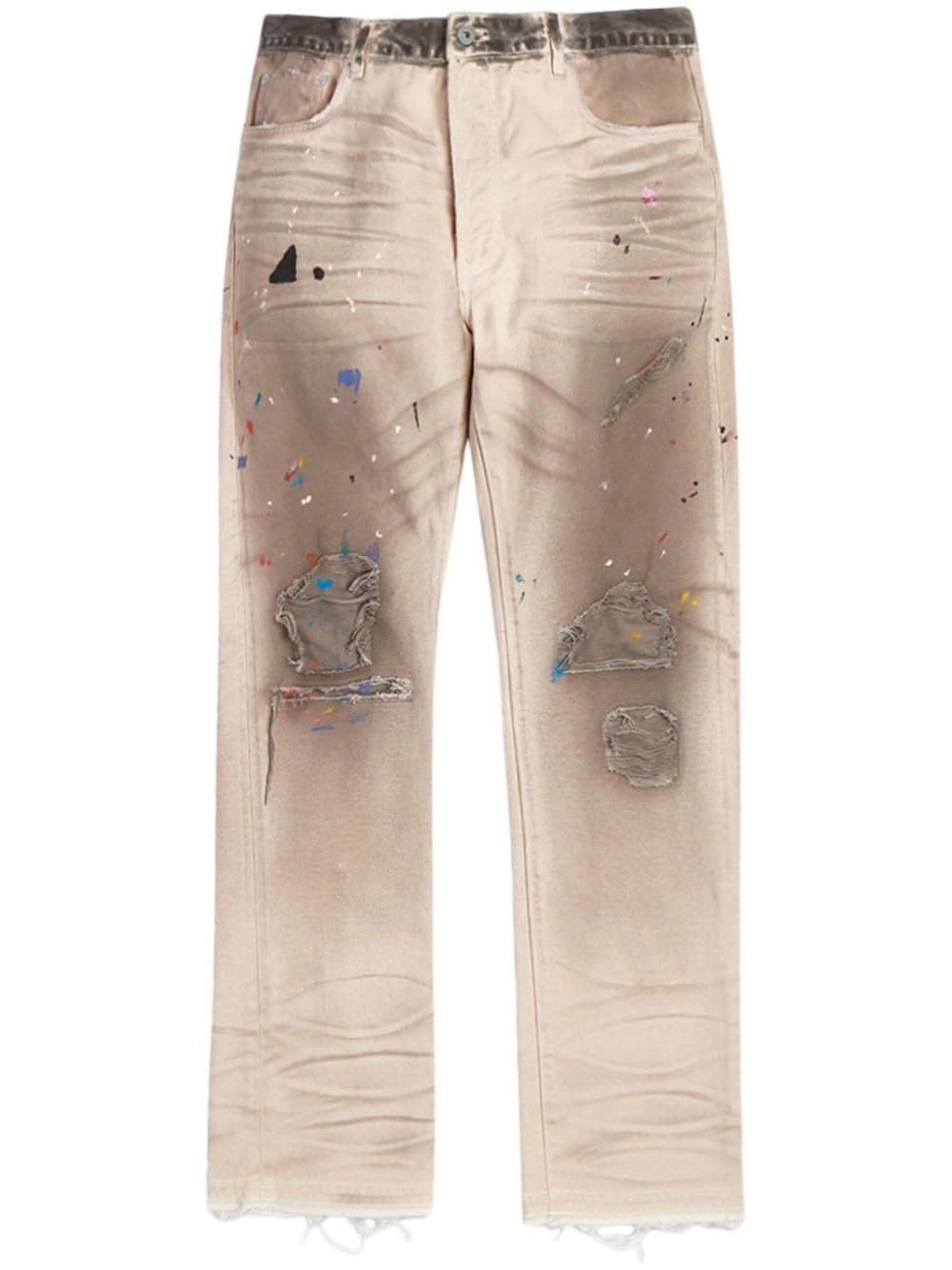 Hollywood distressed jeans Designed and produced in LA, these jeans by GALLERY DEPT. are hand-rendered by in-house artisans. Their distressed look is achieved with tears, rips and paint splatters. They're cut to the label's 5001 silhouette that offers a slim-fitting, straight-leg design. Highlights - Beige - Cotton/denim - Distressed effect - Faded effect - Ripped detailing - Paint splatter detail - Belt loops - Concealed fly and button fastening - Classic five pockets - Whiskering effect at the thighs - Slim cut - Straight leg - Raw edge Made in United States Composition Cotton 100%