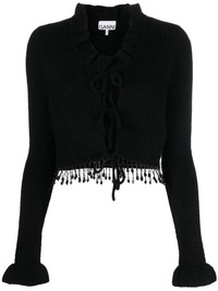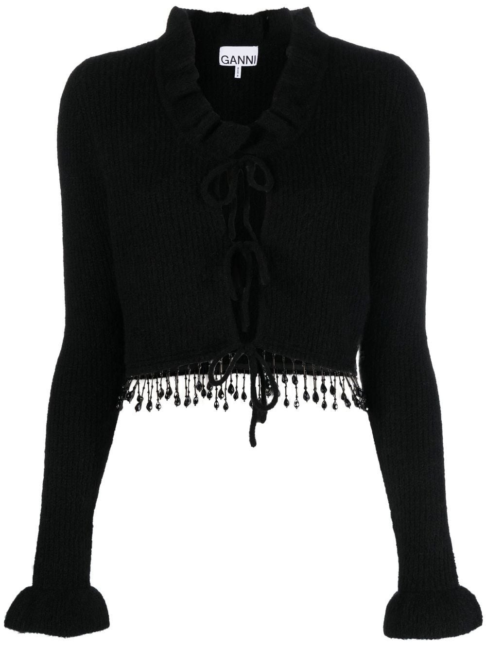 beaded fringe knitted cardigan Highlights - Black - Merino wool blend - Knitted construction - Beaded fringe trim - Frilled edges - Self-tie fastening - Round neck - Long sleeves - Cropped Imported Composition Merino 32%, Alpaca Wool 32%, Polyamide 30%, Elastane 6% SIZE & FIT Measurement SLEEVE LENGTH 25.19 in(64 cm) LENGTH 16.14 in(41 cm) FittingInformation This piece fits true to size. We recommend you get your regular size Cut for a slim fit Made with a lightweight fabric Washing instructions Hand Wash