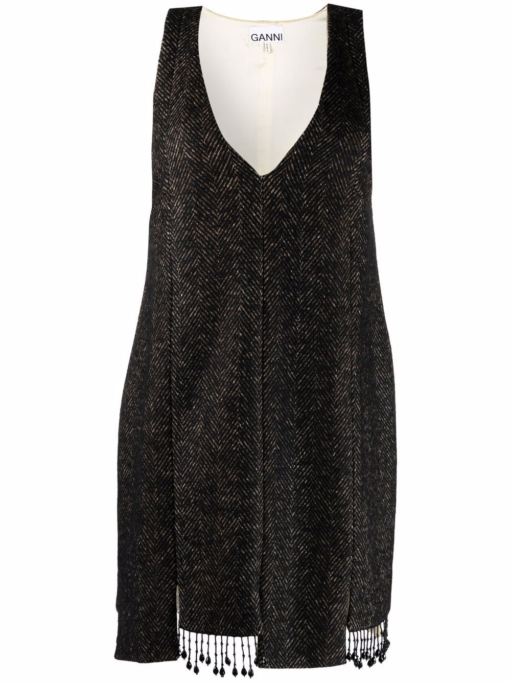 beaded step-hem shift dress black wool-recycled cotton blend herringbone step hem beaded trim detail shift style sleeveless V-neck Imported Composition Outer: Polyester 27%, Acrylic 20%, Recycled Cotton 20%, Wool 12%, Cotton 11%, Alpaca Wool 9%, Other fibres 1% Lining: Viscose 100% SIZE & FIT Model measurements Height 5 ft 9 in(1.76 m) Bust/Chest 33.07 in(84 cm) Hips 34.64 in(88 cm) Waist 25.59 in(65 cm) FittingInformation This piece fits true to size. We recommend you get your regular size Cut for a loose fit Made with a mid-weight non-stretch fabric Washing instructions Dry Clean Only