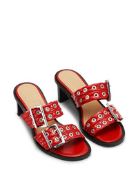 RED FEMININE BUCKLE HEELED MULE SANDALS