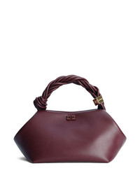 small Bou cross body bag As part of the Danish brand’s commitment to phase out virgin leather from all products by the end of 2023, GANNI introduces the Bou bag. The playful hexagonal silhouette is enhanced by a braided strap design and the label's Butterfly logo. Highlights - Burgundy - Recycled leather - Gold-tone hardware - Logo plaque - Magnetic fastening - Adjustable detachable shoulder strap - Single braided top handle - Partitioned compartment - Internal slip pocket Imported Composition Recycled Leather 65%, Polyurethane 19%, Polyester 16% SIZE & FIT Measurement DEPTH 6.69 in(17 cm) HEIGHT 5.51 in(14 cm) STRAP 19.68 in(50 cm) WIDTH 11.02 in(28 cm)