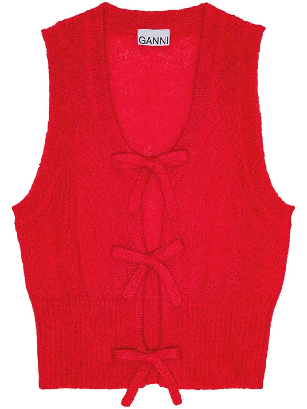bow detailing sleeveless vest Highlights - Red - Ribbed knit - Scoop neck - Bow detailing - Sleeveless - Ribbed hem Imported Composition Mohair 55%, Recycled Polyamide 29%, Merino 16%