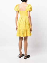 broderie anglaise flared dress Crafted from organic cotton, this bright yellow minidress from Ganni boasts a delicate side of the brand through the flowy silhouette, puff sleeves and romantic broderie anglaise construction. Highlights - Lemon yellow - Organic cotton - Broderie anglaise - Square neck - Short puff sleeves - Fitted waistline - Flared skirt - Above-knee length - Straight hem Imported Composition Outer: Organic Cotton 100% SIZE & FIT Model measurements Height 5 ft 10 in(1.77 m) Bust/Chest 31.49 in(80 cm) Hips 35.43 in(90 cm) Waist 25.19 in(64 cm) Measurement HIPS 40.15 in(102 cm) LENGTH 36.22 in(92 cm) WAIST 25.59 in(65 cm) FittingInformation Designed for a close fit at the chest and waist with a loose fit at the hip The internal slip sits just away from the body, offering a close yet comfortable fit Made from a midweight non-stretch fabric This piece fits true to size – take your usual size