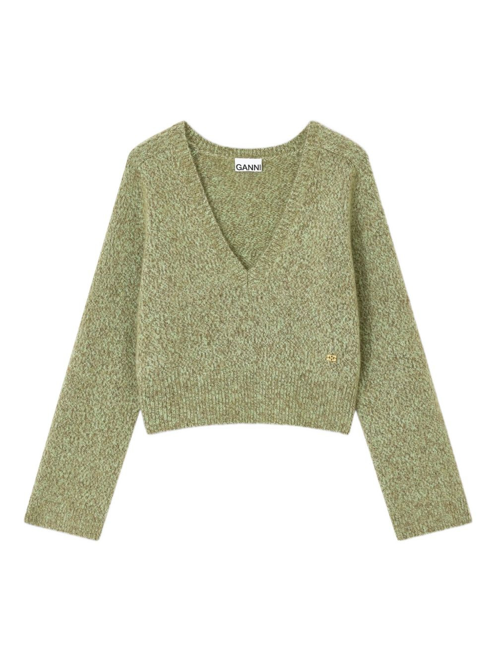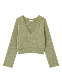 brushed v-neck sweater Highlights - Green - V-neck - Long sleeves - Ribbed hem Imported Composition Wool 39%, Mohair 30%, Recycled Polyester 29%, Elastane 2% Washing instructions Read Manufacturer Guidelines