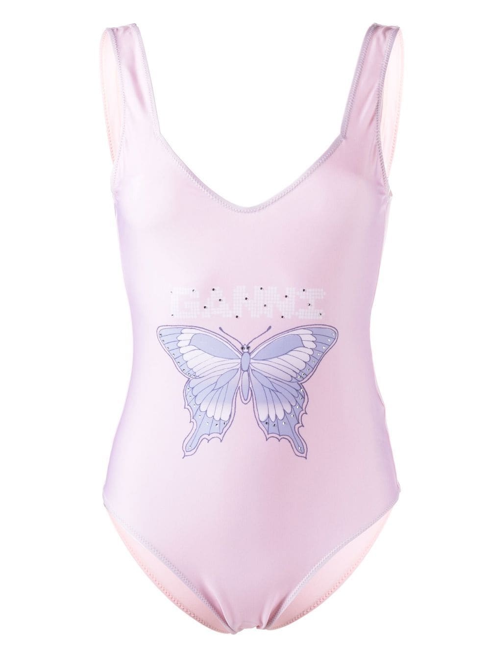 butterfly logo-print swimsuit Highlights - Lilac - Recycled polyester blend - Butterfly print - Logo print to the front - V-neck - Sleeveless - Low back - Be mindful to try on swimwear over your own garments. Imported Composition Outer: Recycled Polyester 78%, Spandex/Elastane 22% Lining: Recycled Polyamide 83%, Spandex/Elastane 17%