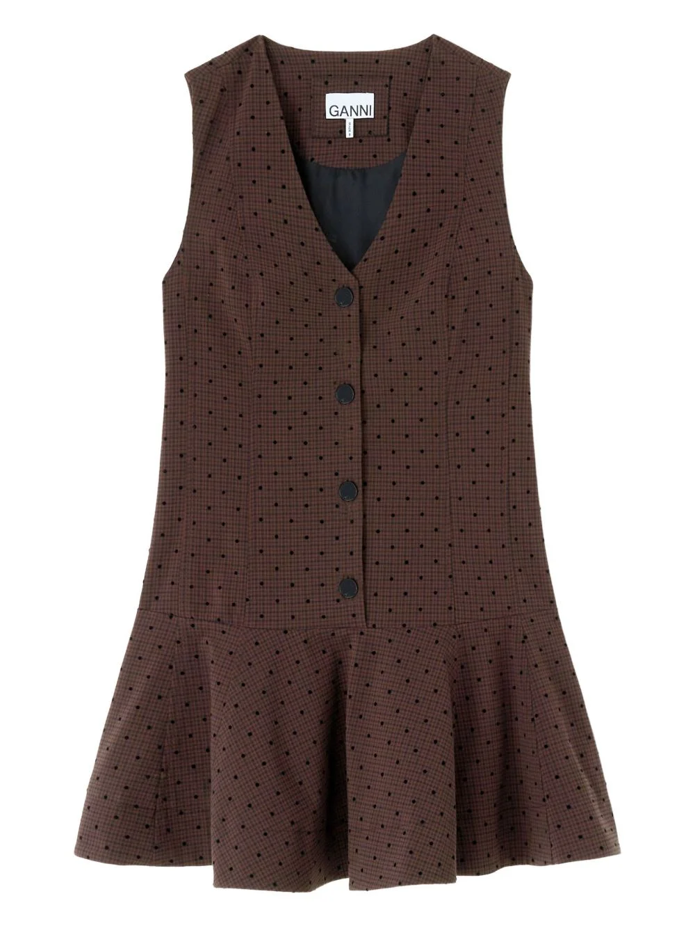 button polka dot dress Highlights - Brown - Polka dot pattern - V-neck - Button fastening - Sleeveless - Ruffled hem Imported Composition Fabric 100% Washing instructions Read Manufacturer Guidelines