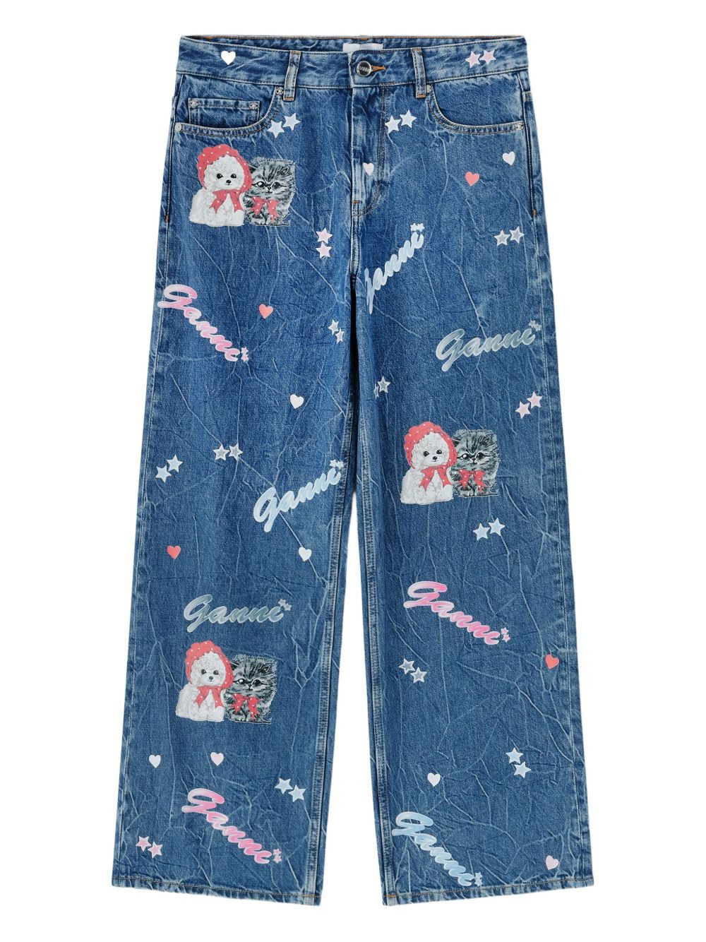 cat-print star-embellished jeans Highlights - Blue - Cat print - Star embellishments - Embroidered lettering - Distressed effect - Five-pocket design Imported Composition Denim 100% Washing instructions Read Manufacturer Guidelines