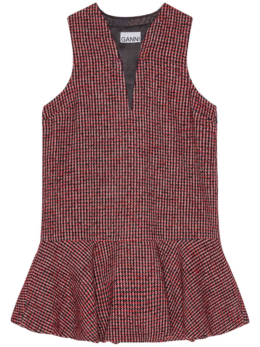 checked mini dress Highlights - Red - Check pattern - Plunging v-neck - Sleeveless - Ruffle hem - Flared hem - Thigh-length - Pull-on style Imported Composition Recycled Polyester 50%, Recycled Wool 50%