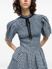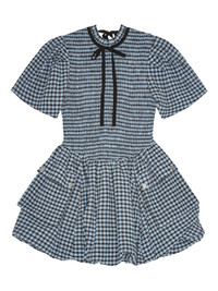 checked seersucker mini dress Highlights - Cornflower blue - Self-tie fastening - Smocked panel - Short puff sleeves - Puffball hem Imported Composition Organic Cotton 61%, Recycled Polyester 38%, Elastane 1%