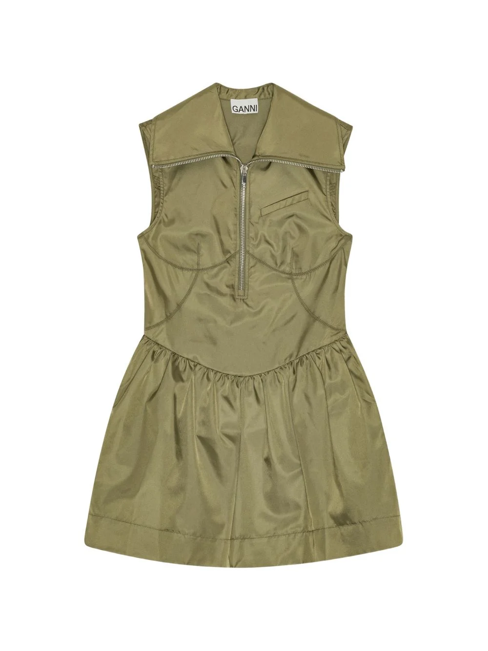 collared zipped mini dress Highlights - Olive green - Sleeveless - Zip fastening - Gathered detailing - Chest pocket Imported Composition Fabric 100% Washing instructions Read Manufacturer Guidelines