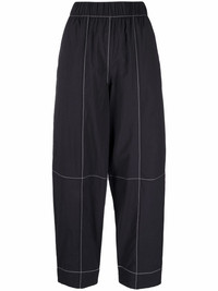 contrast-stitching straight trousers Cut for a wide straight leg, these GANNI trousers embody the brand's effortlessly cool Scandinavian style. The organic cotton pair is crafted with a crepe finish, has an elasticated waist for added comfort, and is accented with contrast white stitching throughout. Highlights - Black - Organic cotton-blend - Contrast stitching - Elasticated waistband - Straight leg - Two side inset pockets - Slip-on style Imported Composition Organic Cotton 52%, Polyamide 45%, Spandex/Elastane 3% SIZE & FIT Model measurements Height 5 ft 11 in(1.8 m) Bust/Chest 31.49 in(80 cm) Hips 36.61 in(93 cm) Waist 24.4 in(62 cm) FittingInformation This piece fits true to size. We recommend you get your regular size Designed to be fitted at the waist and hips, loose over the leg Made with a mid-weight stretch fabric Washing instructions Machine Wash
