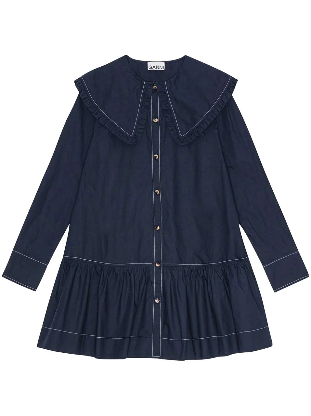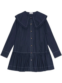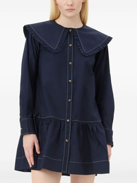 cotton poplin mini dress Highlights - Navy blue - Organic cotton - Poplin texture - Front button fastening - Contrast stitching - Oversized pointed collar - Ruffled detailing - Long sleeves - Buttoned cuffs - Gathered detailing - Straight hem - Thigh-length Imported Composition Organic Cotton 100% Washing instructions Read Manufacturer Guidelines