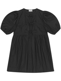 Cotton Poplin Tie String Mini Dress This black mini dress celebrates two of GANNI’s most popular design codes: puff sleeves and playful details. It’s cut from crisp organic poplin to hold the voluminous shape and fastens with self-tie bows through the bodice. Highlights - Black - Organic cotton - Poplin texture - Front tie fastening - Round neck - Short puff sleeves - Thigh-length Made in Italy Composition Organic Cotton 100% Washing instructions Machine Wash