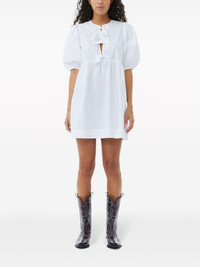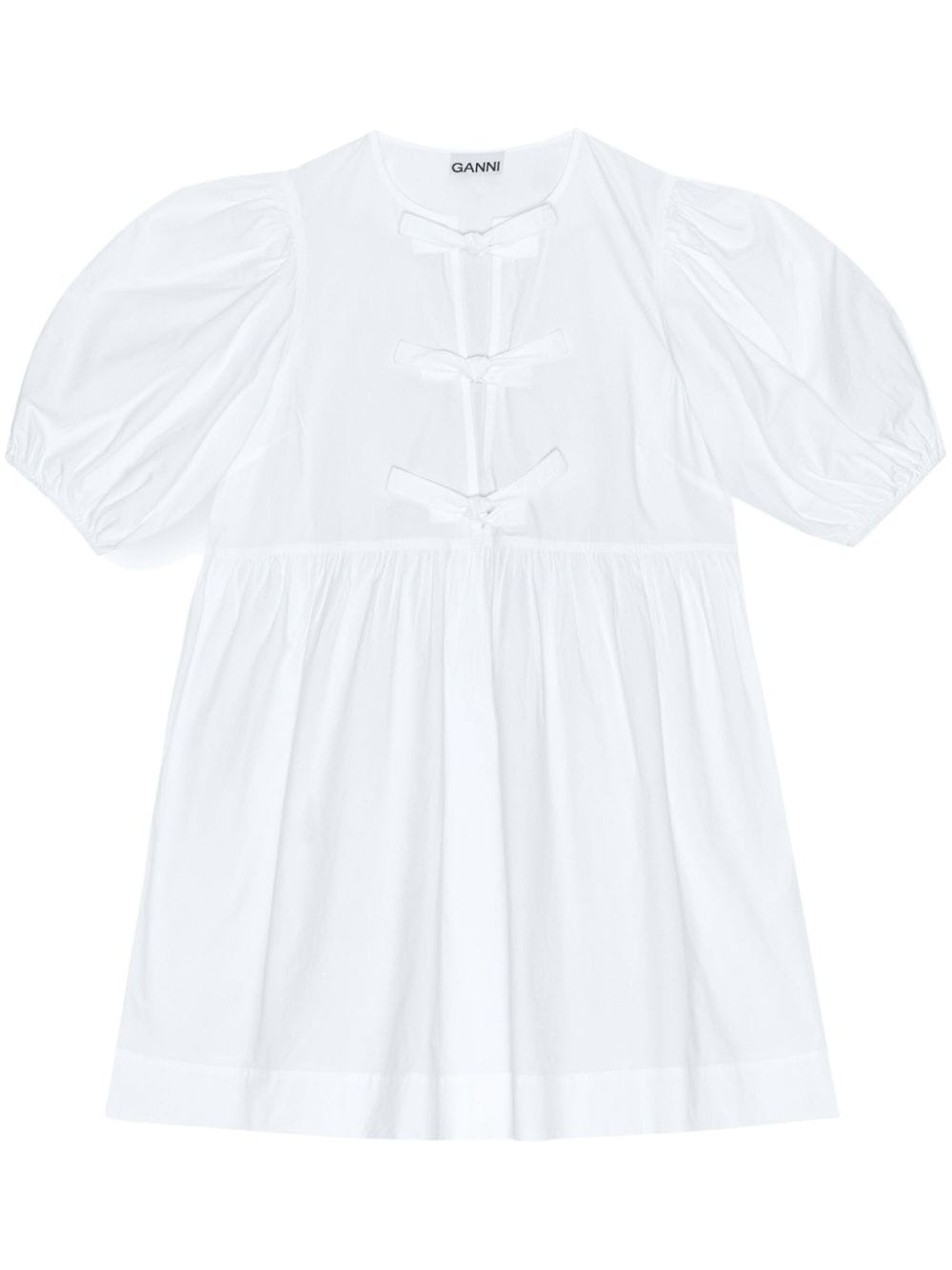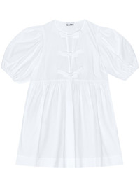 Cotton Poplin Tie String Mini Dress GANNI is mainly known for its simple and effortlessly chic style. Designed for a relaxed fit, this white mini dress is crafted from organic cotton and adorned by front-tie bows. Highlights - White - Organic cotton - Bow detailing - Round neck - Short puff sleeves - Straight hem Imported Composition Organic Cotton 100%