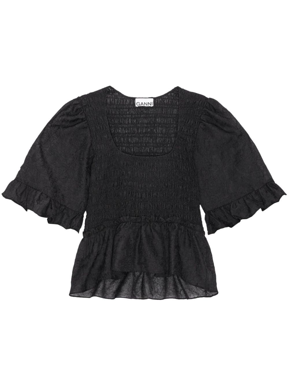 Crinkled Georgette Smock Blouse Highlights - Black - Recycled polyester - Crinkled finish - Georgette - Smocked panel - Semi-sheer panels - Scoop neck - Half-length sleeves - Peplum hem Imported Composition Recycled Polyester 100% Washing instructions Read Manufacturer Guidelines
