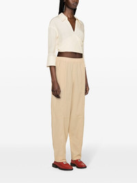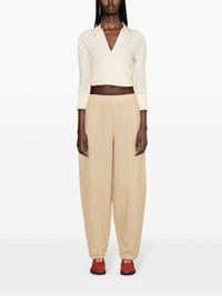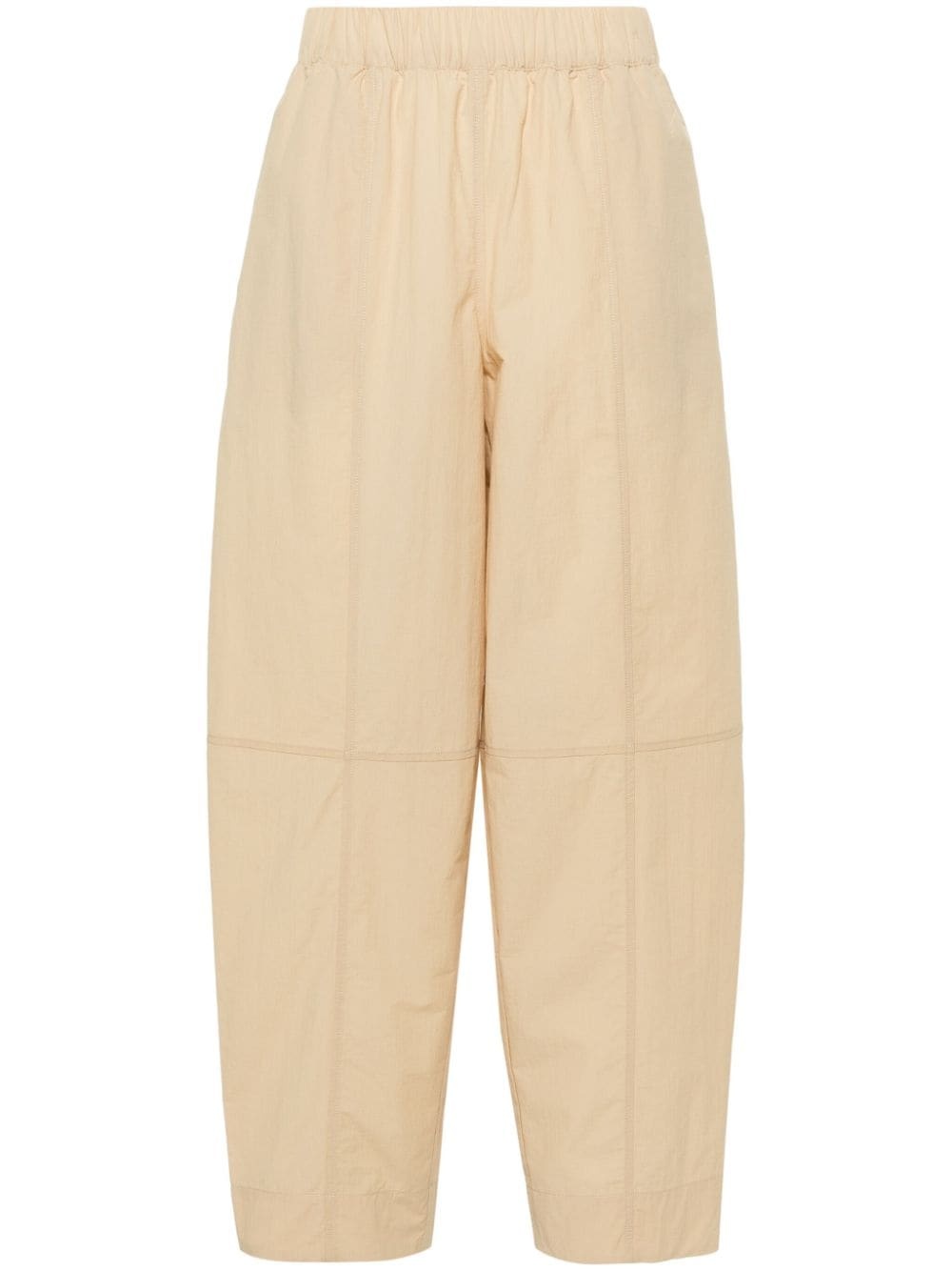 Curve tapered-leg trousers These trousers from GANNI are in keeping with the label's approach to lower-impact design. They're cut from an organic cotton blend to a tapered silhouette with subtly curved legs. Highlights - Light beige - Organic cotton blend - Lightweight construction - Panelled design - Wide, tapered leg - High-waisted - Elasticated waistband - Two side slit pockets - Unlined Imported Composition Organic Cotton 52%, Polyamide 45%, Elastane 3% SIZE & FIT Model measurements Height 5 ft 11 in(1.8 m) Bust/Chest 34.25 in(87 cm) Hips 35.82 in(91 cm) Waist 24.8 in(63 cm) FittingInformation Designed for a tapered fit, these trousers allow for a close fit at the waist and a loose unrestricted fit over the leg with a closer fit towards the ankle The elasticated waist allows for a comfortable fit Made from a lightweight fabric This piece fits true to size – take your usual size Washing instructions Machine Wash