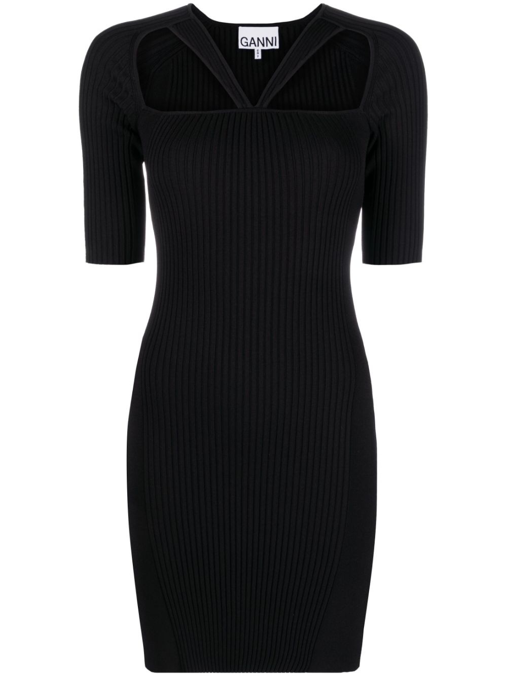 cut-out minidress The simple silhouette of this black dress from GANNI is enhanced by its front cut-outs and ribbed design. It's cut with cropped sleeves and a mini-length hem. Imported Composition Rayon 56%, Polyamide 30%, Spandex/Elastane 14% SIZE & FIT Model measurements Height 5 ft 11 in(1.8 m) Bust/Chest 31.49 in(80 cm) Hips 35.43 in(90 cm) Waist 25.19 in(64 cm) Measurement HIPS 25.19 in(64 cm) LENGTH 33.07 in(84 cm) WAIST 18.11 in(46 cm) Washing instructions Machine Wash