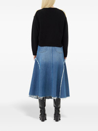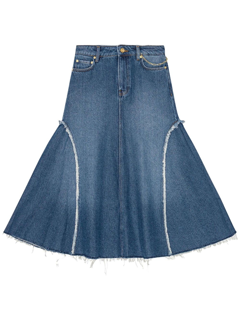 denim midi skirt Highlights - Indigo blue - Organic cotton - Washed denim - Concealed fly and button fastening - High-waisted - Belt loops - Rivet detailing - Classic five pockets - Frayed edge - Raw-cut edge - Applique logo - Flared hem - Mid-length Imported Composition Organic Cotton 100% Washing instructions Read Manufacturer Guidelines