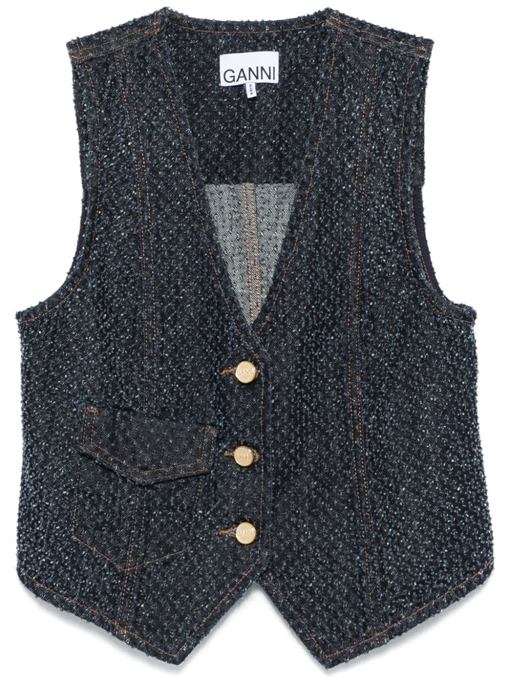 denim waistcoat Highlights - Medium blue - Organic cotton - Denim - Front button fastening - Textured finish - Distressed effect - V-neck - Sleeveless - Side flap pocket - Unlined - Asymmetric hem Imported Composition Organic Cotton 100% Washing instructions Machine Wash